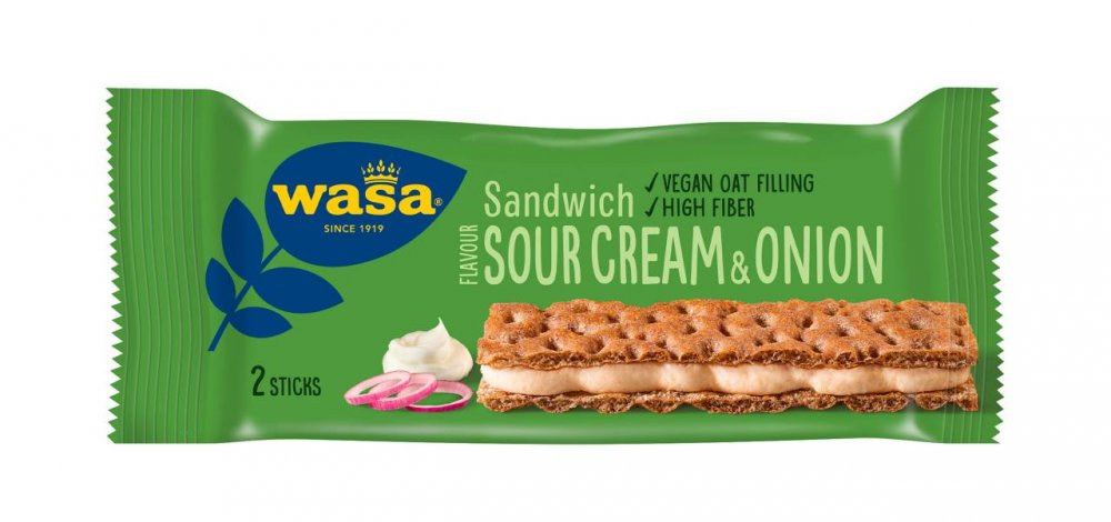 Upptäck Wasa Sandwich Sourcream & Onion, det perfekta mellanmålet på språng var du än är. Wasa Sandwich Sourcream & Onion är ett fiberrikt mellanmål med fullkorn gjort på fullkornsrågknäckebröd i ett behändigt fickformat bestående av två knäckehalvor med en smaskig påläggskräm emellan. Trots att fyllningen smakar gräddfil och lök är den havrebaserad och 100 % vegansk.